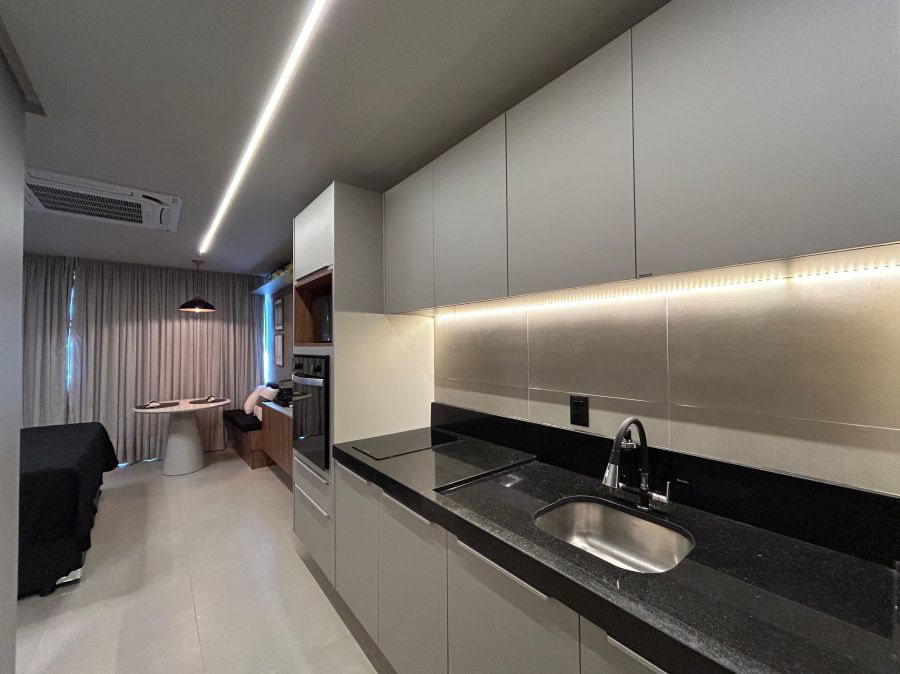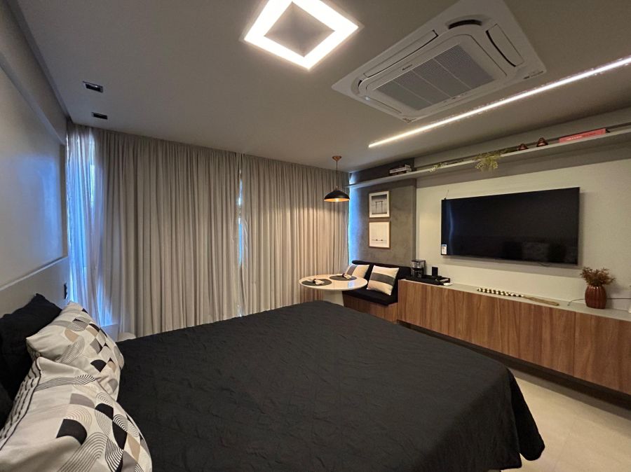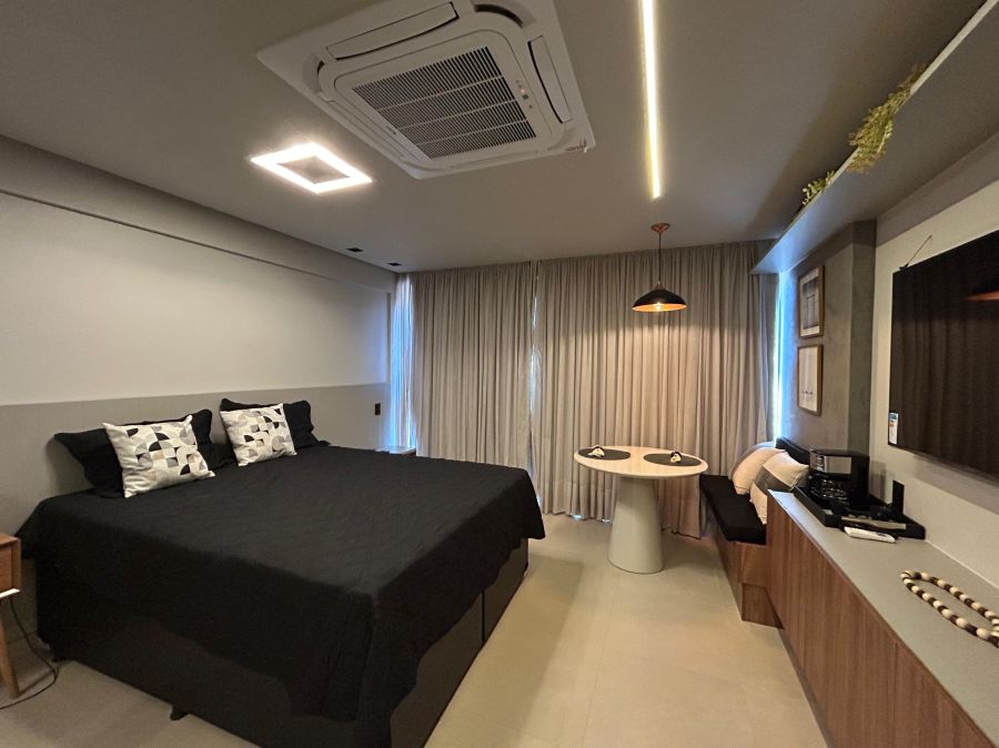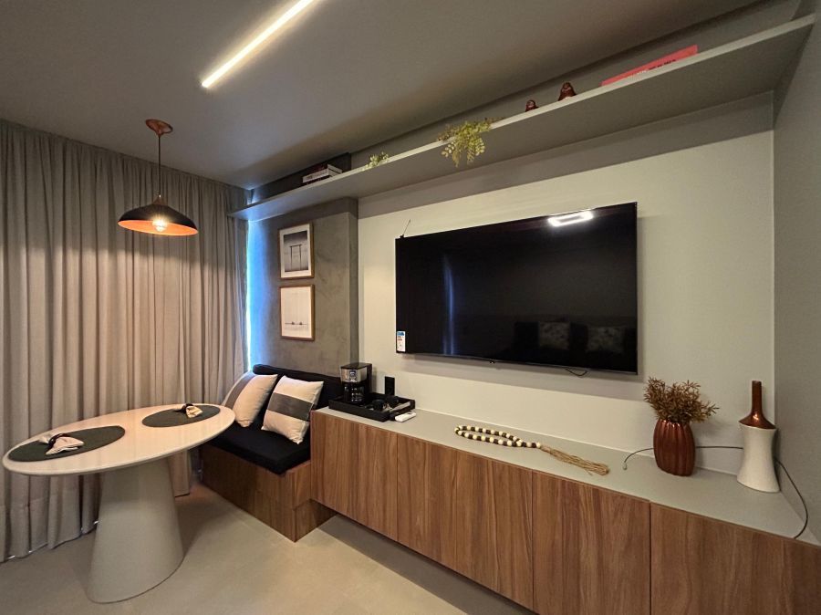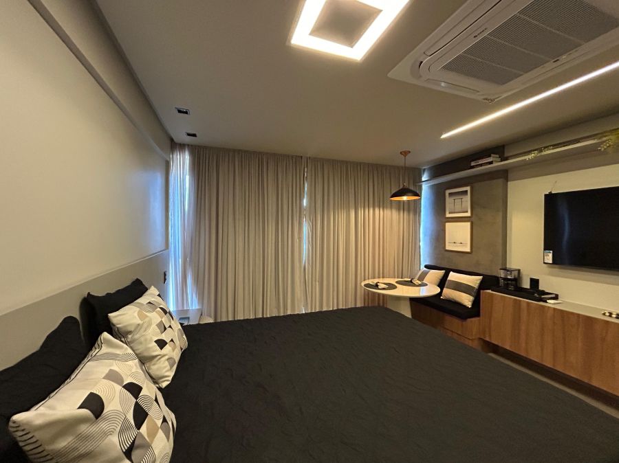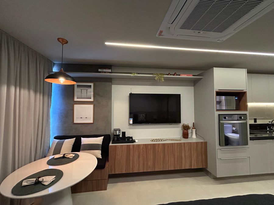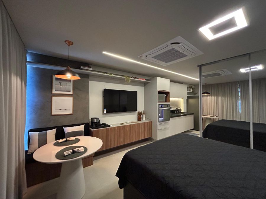 Este aconchegante apartamento de 30m² oferece o equilíbrio perfeito entre conforto e praticidade. Totalmente equipado e mobiliado, possui 1 suíte elegante, sala convidativa e cozinha funcional, ideal para quem busca um lar completo e sem preocupações.