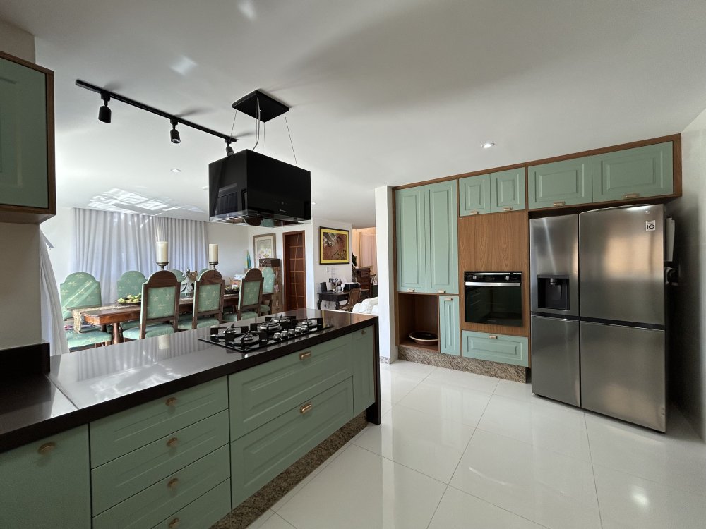 Sala de jantar integrada à cozinha com ilha e armários planejados.